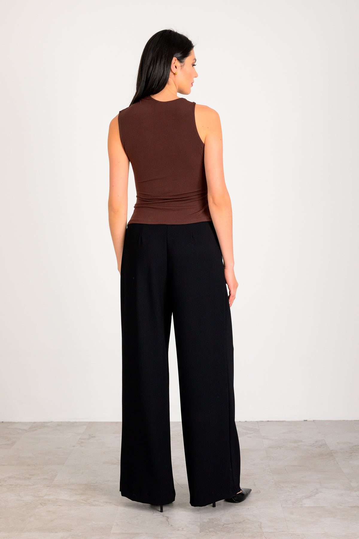 Twisted shoulder detail sleeveless top with rushing side detail.
