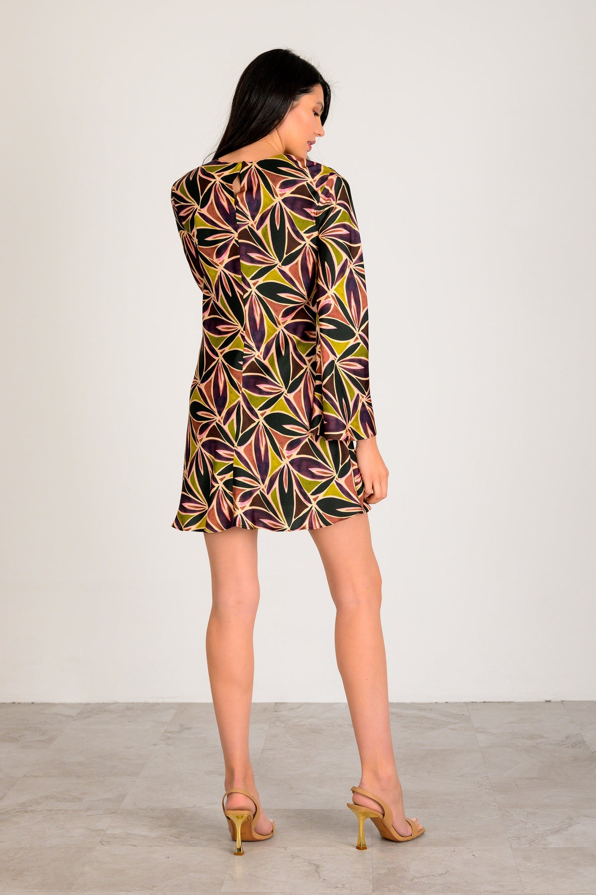 Mini long sleeve bias dress in a multi colored abstract leaf print for fall.
