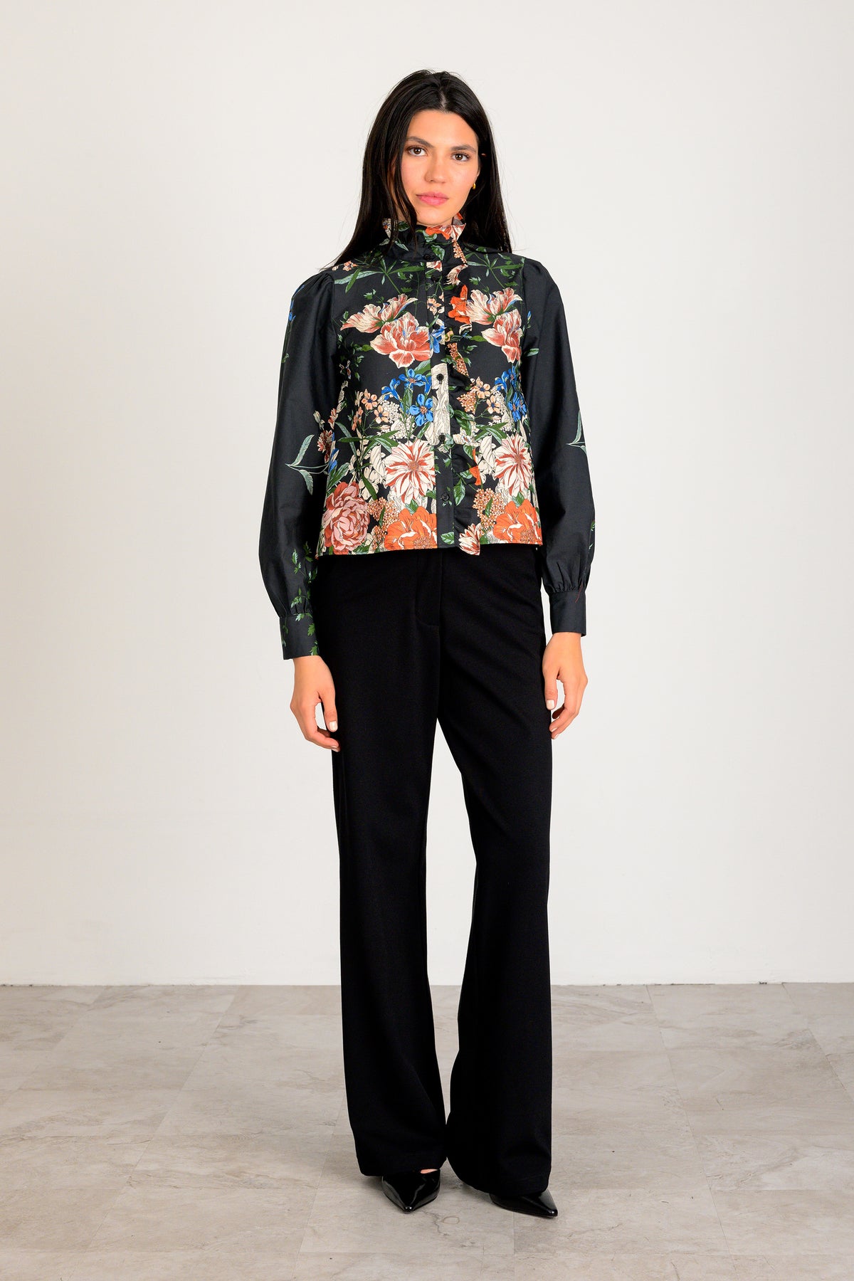 Black multi floral printed cotton button down top with ruffle detail at neck and front placket for feminine touch.